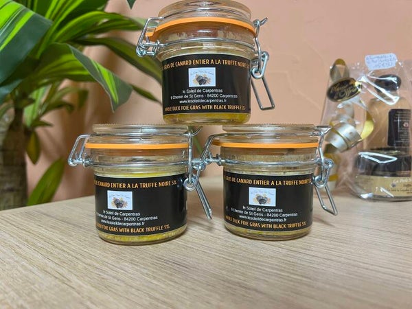 Ingrédients : Foie gras de canard entier 93%, truffes noire tuber melanosporum 5%, sel de guérande, poivre.